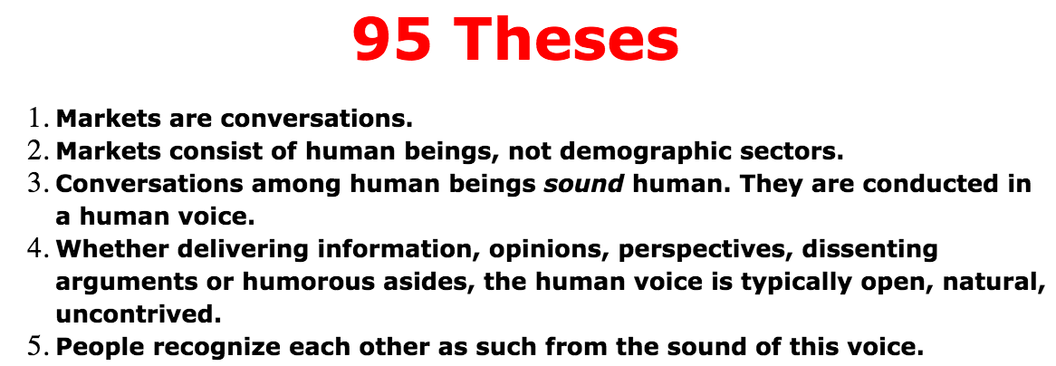 Way back in 1999, Rick Levine, Christopher Locke, Doc Searls, and David Weinberger published a list of 95 theses about business to the web. They outlined a future where consumers, users and eyeballs were treated like people. Some of the platforms have changed, but their words are more valuable now than ever.