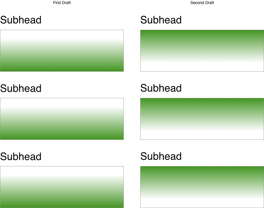 In the image below, the darker the green, the more interesting the content. A first draft helps you organize your ideas and get your thoughts on paper. It's writer-centric. But a second draft should be organized for the reader. The key takeaways are exactly where they need to be. Readers should be able to navigate through the content without exerting themselves. A second draft is reader-centric.