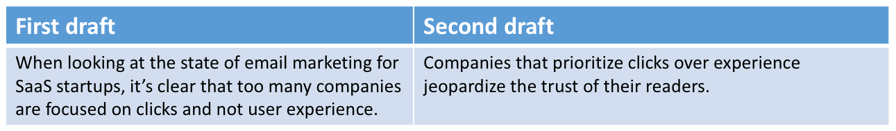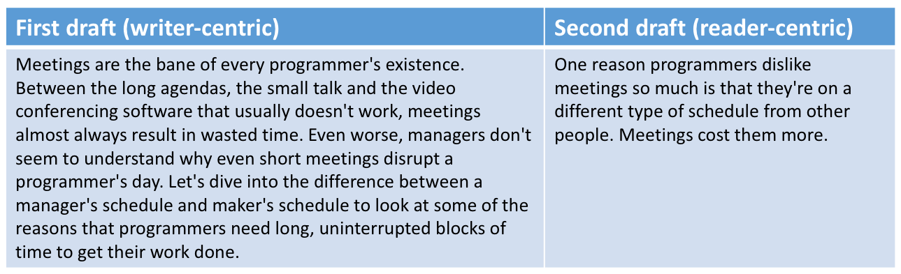 In the example below, the "second draft" is the actual intro of Paul Graham's Maker's Schedule, Manager's Schedule. The "first draft" is how I imagine his first draft may have looked (and it's the type of intro I see way too often in published work).