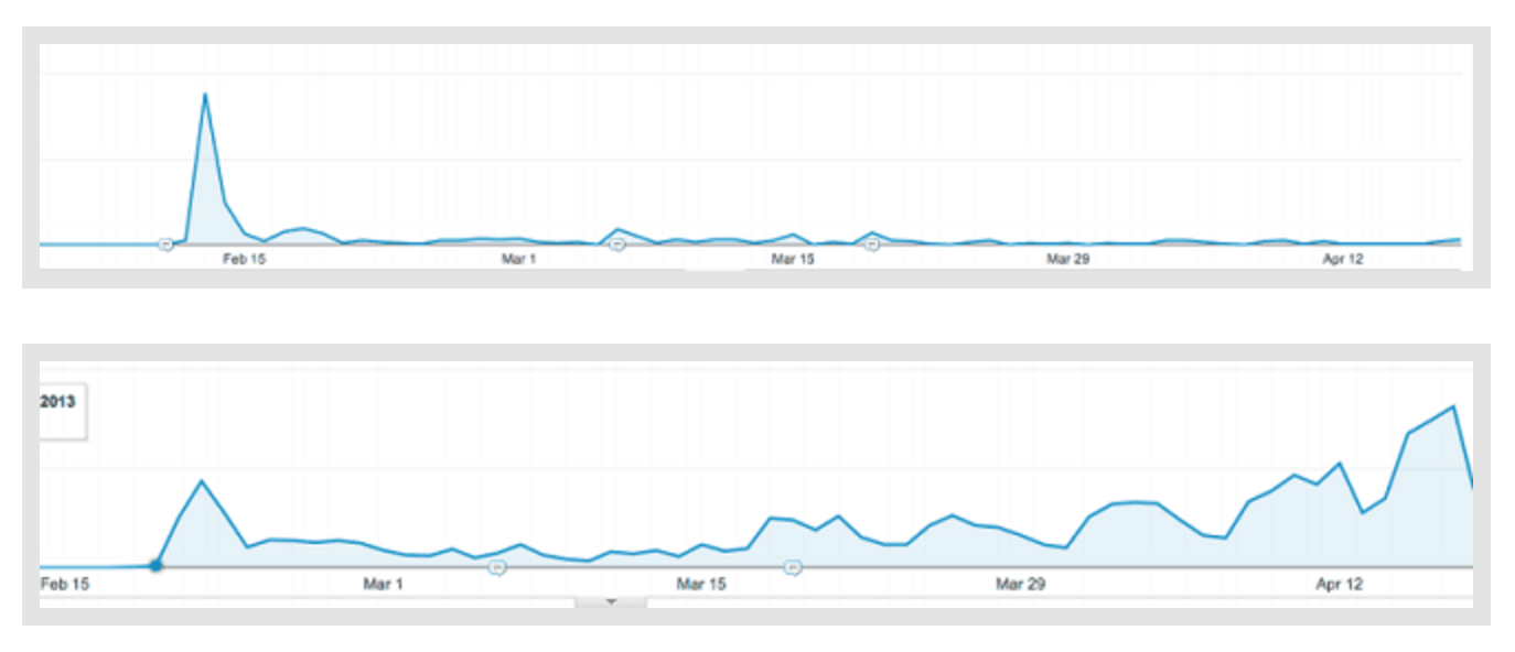 The first chart below is an article without a target keyword, the second is one with a keyword that was later able to rank as the #1 result.